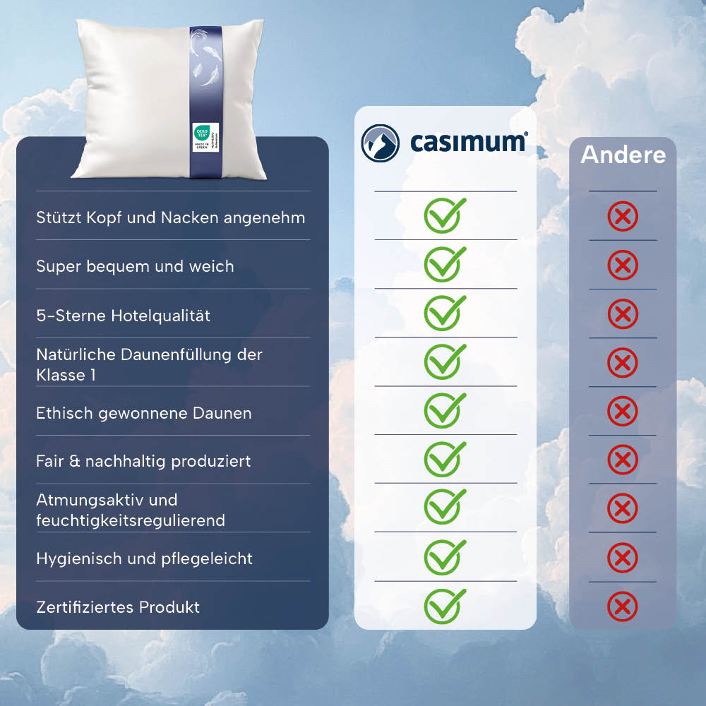 Hülle dich in himmlische Weichheit und schlafe wie auf Wolken mit unserem luxuriösen Daunenkissen.