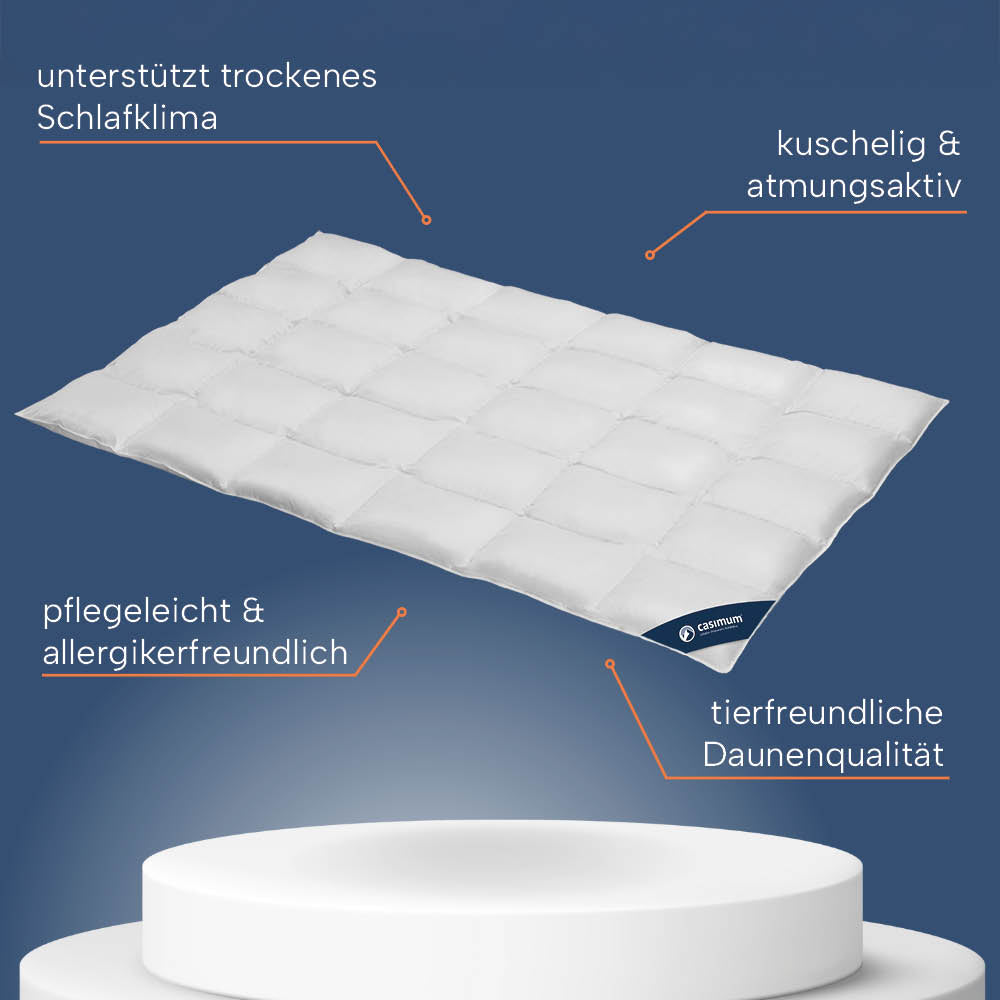 Dank des hohen Daunenanteils fühlt sich die Decke wunderbar leicht an und lässt deine Haut atmen – ideal für warme Sommernächte.