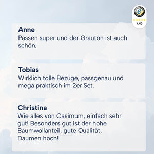 Dank des hochwertigen Baumwoll-Elastan-Mixes bleiben die Bezüge samtweich, formstabil und 100 % bügelfrei. Falls nötig, kannst du den Bezug gelegentlich auslüften – mehr Pflege ist nicht erforderlich.