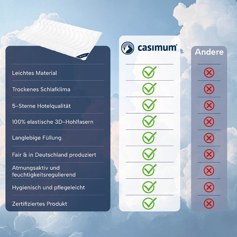 Unsere casimum® Bettdecken werden mit viel Liebe und Sorgfalt in einem traditionellen deutschen Familienbetrieb gefertigt. Jede Decke wird individuell nach deiner Bestellung hergestellt – so erhältst du ein einzigartiges Produkt, das perfekt auf deine Bedürfnisse abgestimmt ist.